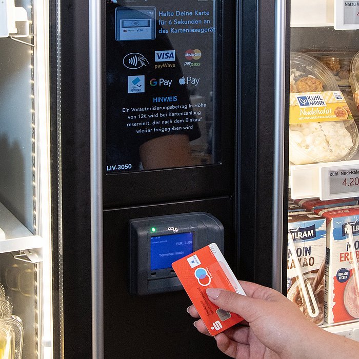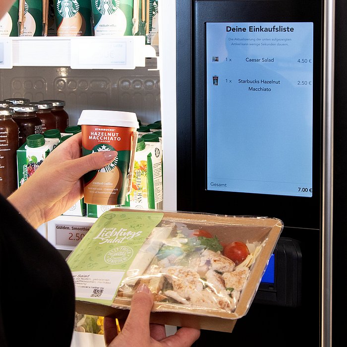 Bedienen Sie sich. Die entnommenen Produkte werden automatisch erkannt und auf dem Bildschirm angezeigt. Nach dem Schließen der Tür wird natürlich nur das berechnet, was entnommen wurde.