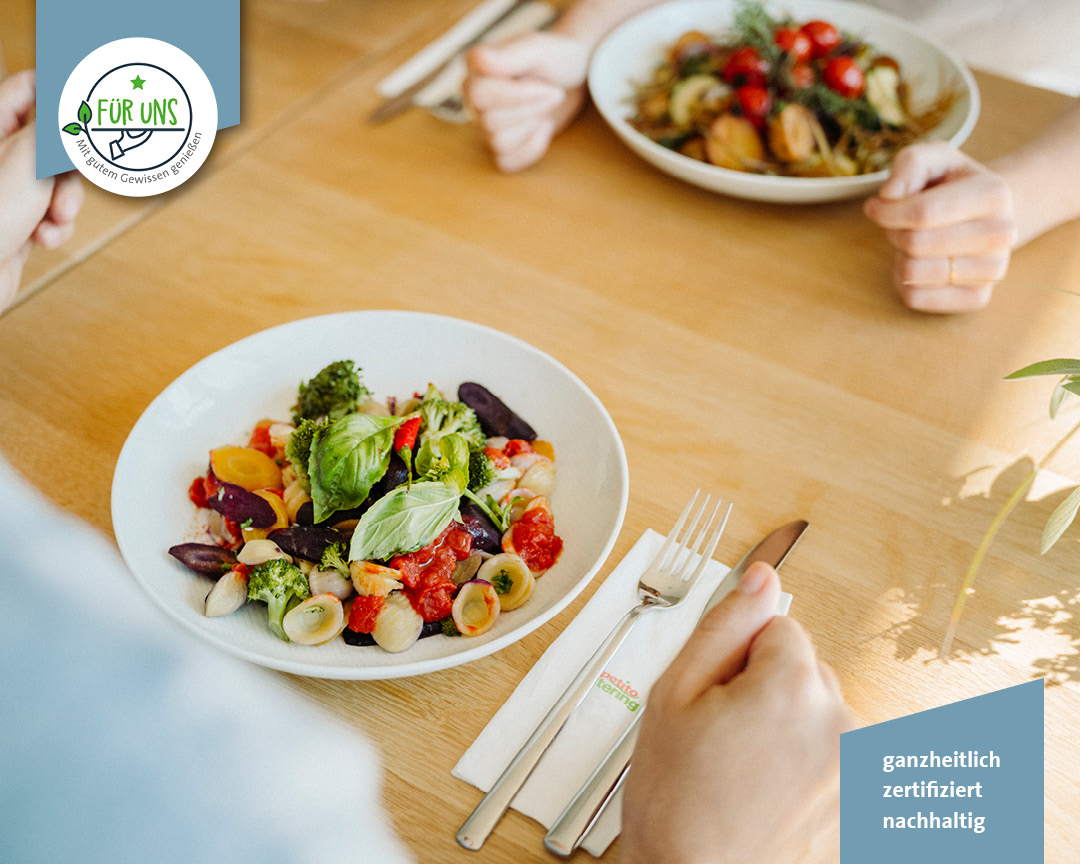 Die Gemeinschaftsverpflegung hat einen großen Hebel und wir können etwas bewirken. Dabei wollen wir alle mitnehmen und insbesondere Entwicklungsmöglichkeiten aufzeigen. Denn unsere Kundinnen und Kunden sind hinsichtlich des Themas Nachhaltigkeit unterschiedlich stark unterwegs. Aus diesem Grund gibt es drei verschiedene Abstufungen des Siegels. Wir arbeiten gemeinsam mit unseren Kundinnen und Kunden daran, die Nachhaltigkeits-Ziele zu erreichen und sich stetig zu verbessern.