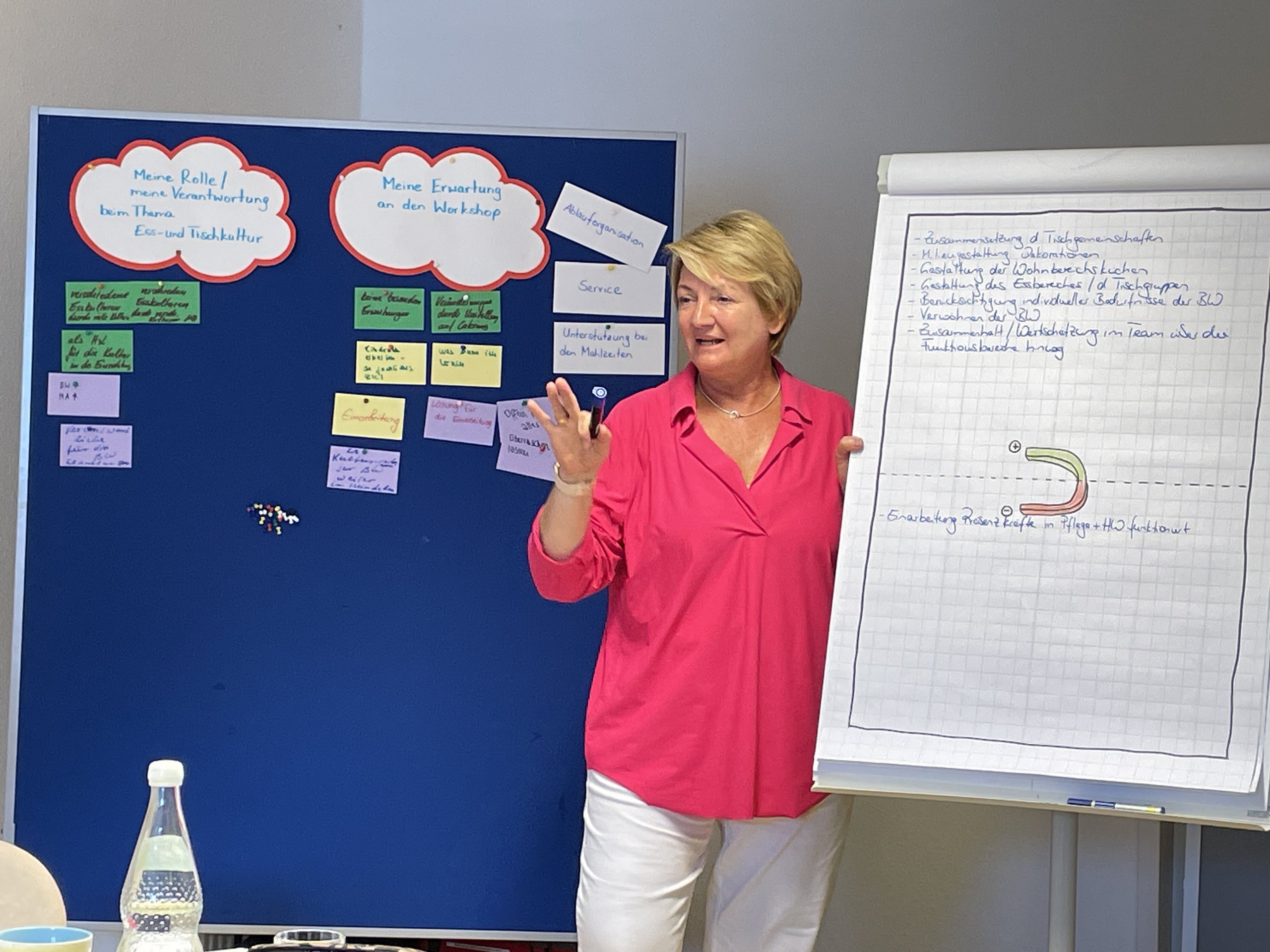 Alle Workshop-Teilnehmerinnen sind sich einig, dass die Mahlzeiten für alle Bewohnerinnen und Bewohner in angenehmer Atmosphäre gestaltet werden müssen. Dazu zählen die wesentlichen Einflussfaktoren wie die Zeit, der Essplatz, die Tischgemeinschaft, die Servicekraft und die Raumgestaltung.