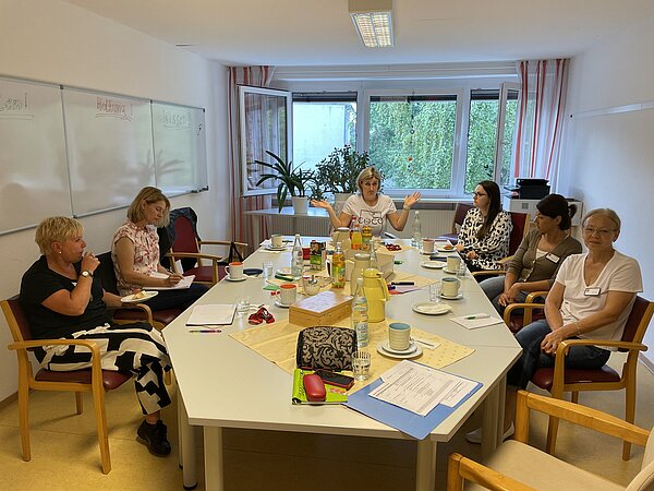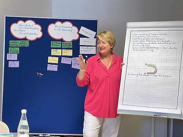 Im Johannes-Haus in Herford möchte das Team inhaltliche Schwerpunkte des Workshops auf die Ablauforganisation, die Gestaltung der Mahlzeiten und die Einarbeitung neuer MitarbeiterInnen legen. In der Bearbeitung ergeben sich schnell konkrete Ansatzpunkte, für die individuelle und praxistaugliche Lösungen erarbeitet werden. So entsteht als Direktmaßnahme ein hausspezifischer Einarbeitungsplan für die Präsenzkräfte. Aspekte wie einfache Sprache, die Verwendung von Bildern und Piktogrammen oder die Bereitstellung von Videos werden dabei berücksichtigt.